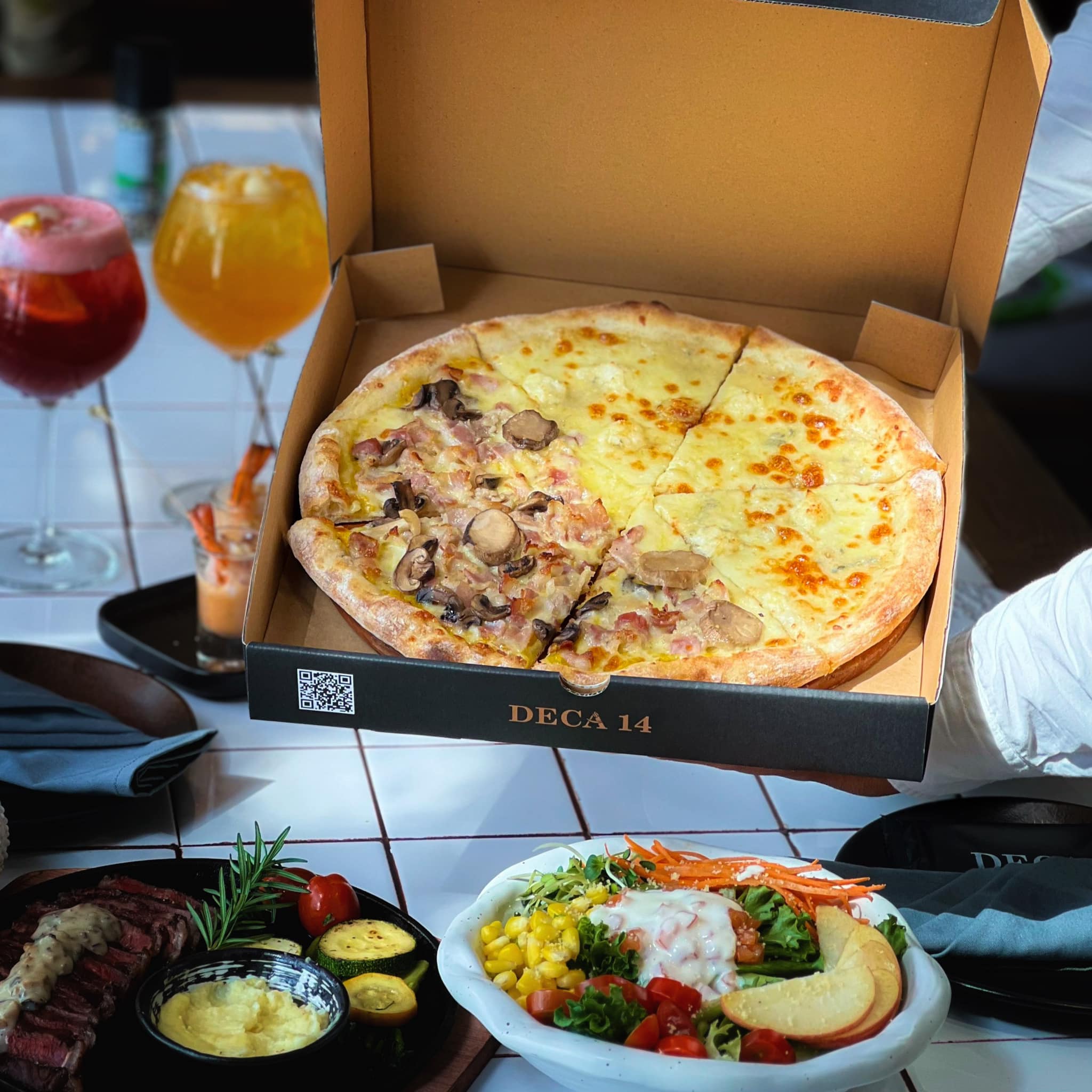 Thực đơn của quán khá phong phú với các loại nước uống và thức ăn Âu-Á. Giá từ 45.000 đồng/món. Deca 14 cập nhật Menu mới nhất đang áp dụng tại quán. Hiện tại DECA 14 đang có ưu đãi pizza đồng giá 169k/cái từ 10-17h mỗi ngày áp dụng mua mang về hoặc ship. Liên hệ hotline đặt hàng: 0833.03.03.03