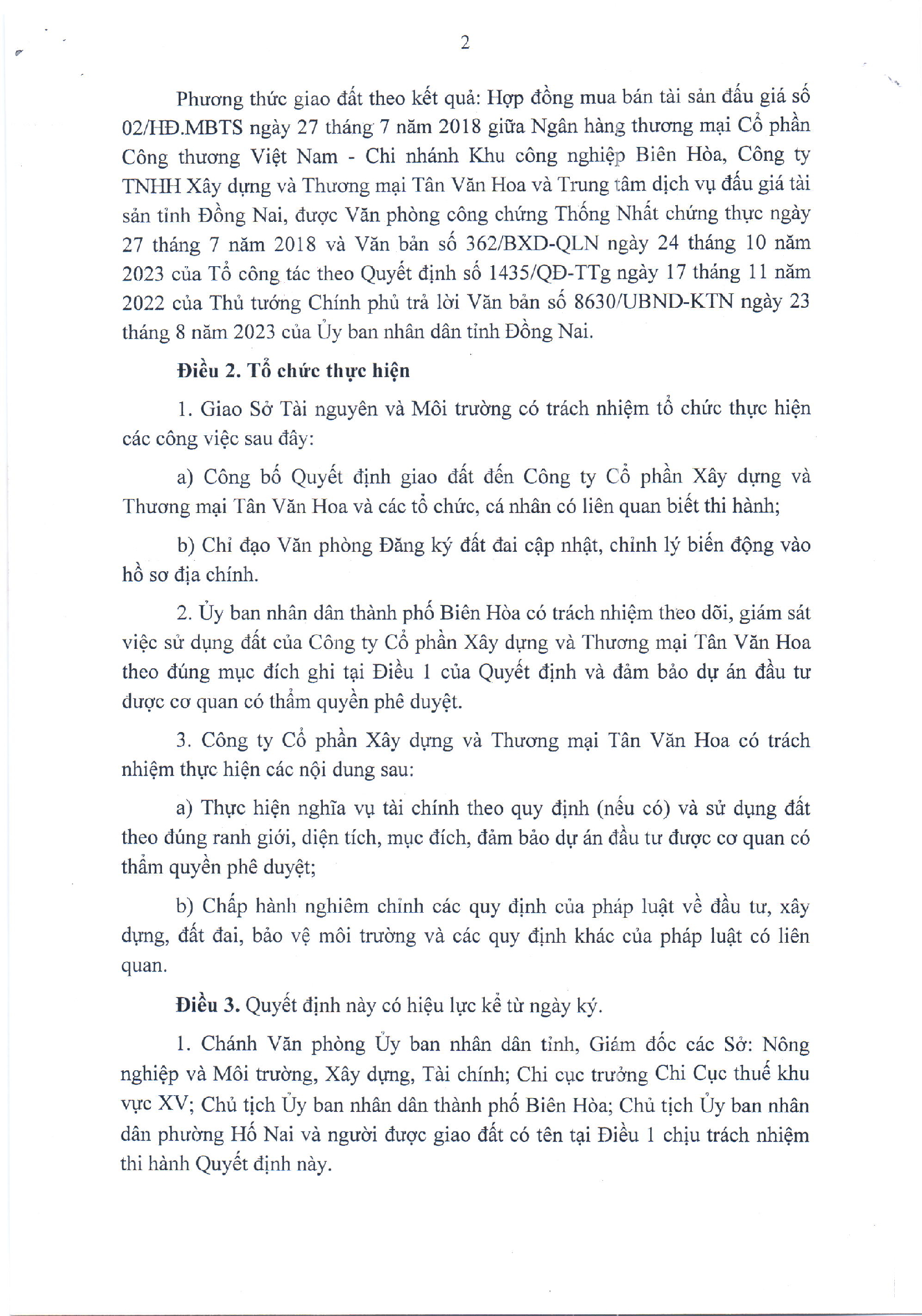 UBND tỉnh giao Sở Nông nghiệp và môi trường có công bố quyết định giao đất đến Công ty CP Xây dựng và thương mại Tân Văn Hoa và các tổ chức, cá nhân có liên quan biết thi hành; chỉ đạo Văn phòng Đăng ký đất đai tỉnh cập nhật, chỉnh lý biến động vào hồ sơ địa chính. UBND thành phố Biên Hòa theo dõi, giám sát việc sử dụng đất của doanh nghiệp theo đúng mục đích và đảm bảo dự án đầu tư được cơ quan có thẩm quyền phê duyệt.