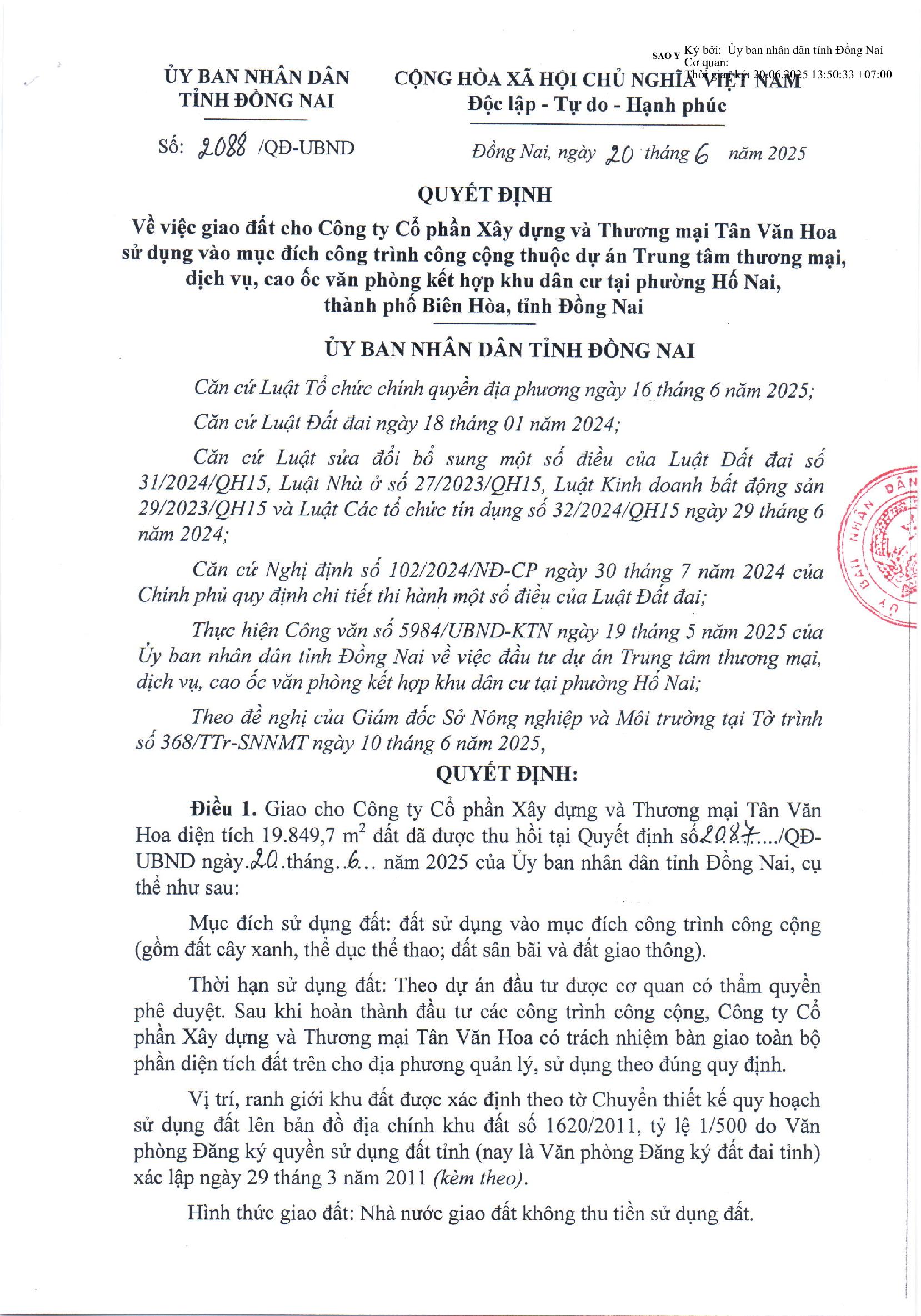 UBND tỉnh giao Sở Nông nghiệp và môi trường có công bố quyết định giao đất đến Công ty CP Xây dựng và thương mại Tân Văn Hoa và các tổ chức, cá nhân có liên quan biết thi hành; chỉ đạo Văn phòng Đăng ký đất đai tỉnh cập nhật, chỉnh lý biến động vào hồ sơ địa chính. UBND thành phố Biên Hòa theo dõi, giám sát việc sử dụng đất của doanh nghiệp theo đúng mục đích và đảm bảo dự án đầu tư được cơ quan có thẩm quyền phê duyệt.