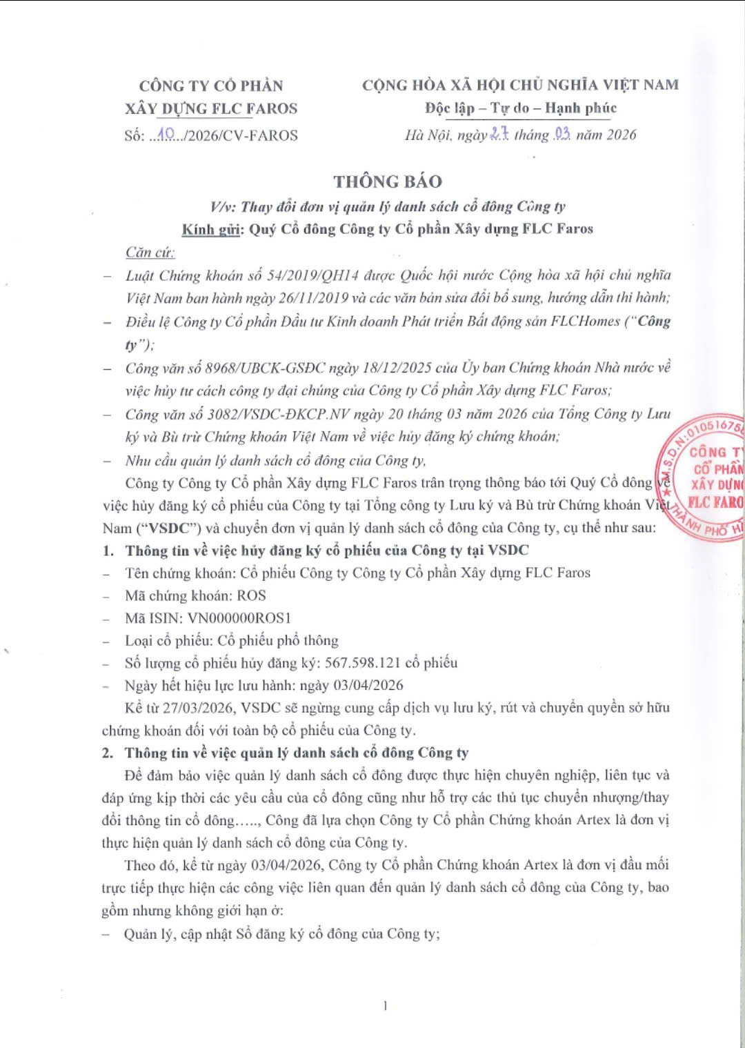 Trước đó ,ngày 6/3/2026, CTCP Chứng khoán Artex thông báo về thủ tục cấp Giấy chứng nhận sở hữu cổ phần đối với các mã cổ phiếu FLC, KLF, AMD, GAB, HAI và FHH.