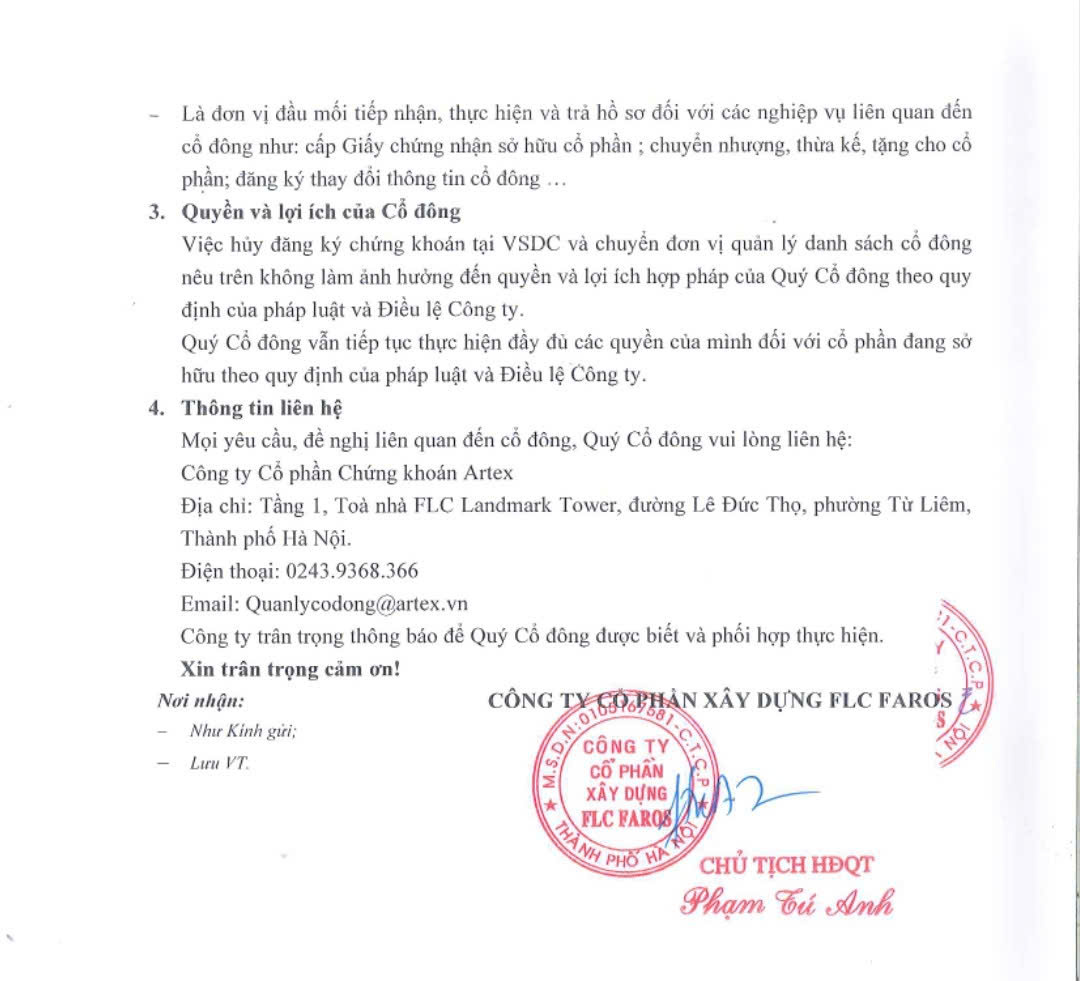 Để đảm bảo đáp ứng kịp thời các yêu cầu của cổ đông, FLC đã lựa chọn CTCP Chứng khoán Artex là đơn vị thực hiện quản lý danh sách cổ đông của công ty. Đây sẽ là đơn vị đầu mối tiếp nhận, thực hiện và trả hồ sơ các nghiệp vụ liên quan đến cổ đông như cấp giấy chứng nhận sở hữu cổ phiếu; chuyển nhượng, thừa kế, tặng cổ phần; đăng ký thay đổi thông tin cổ đông…